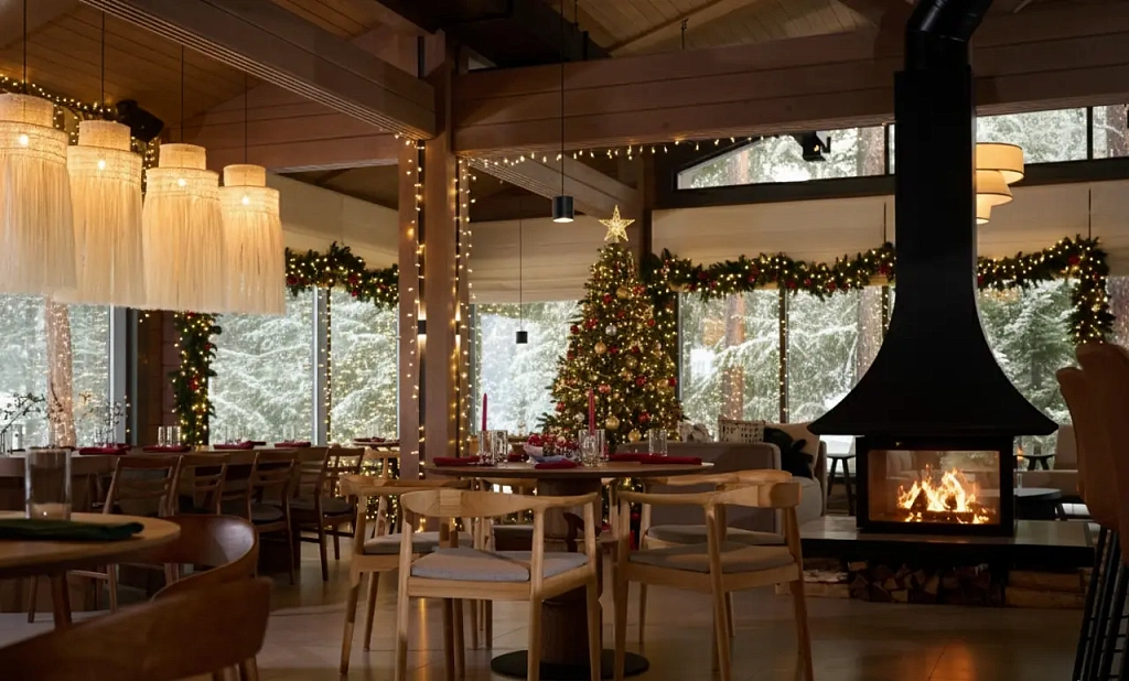 - Ресторан с панорамными окнами — здесь вы будете наблюдать за зимним лесом, не отрываясь от изысканного ужина